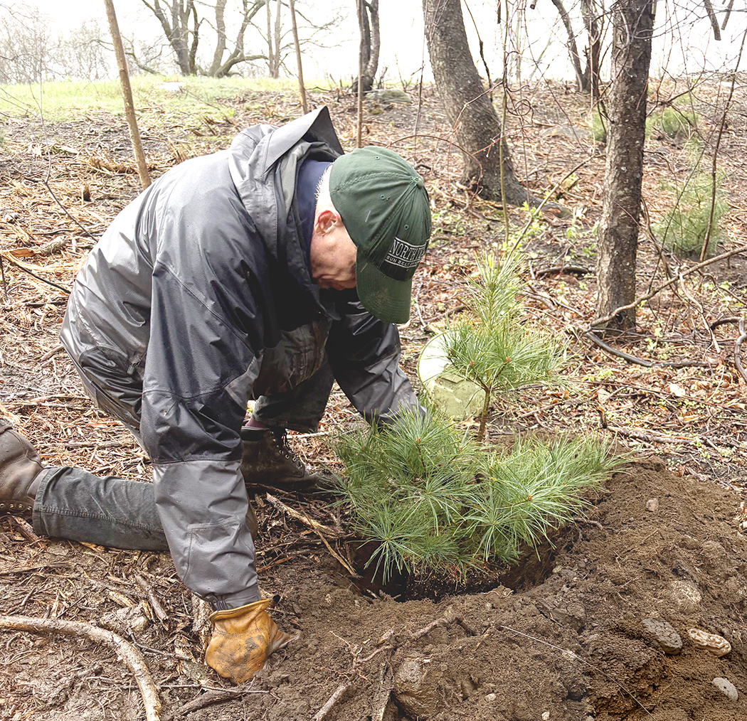 Joe Hibbard plants a white pine at the April 2025 Lone Tree Hill volunteer day. Photo: Jeffrey North