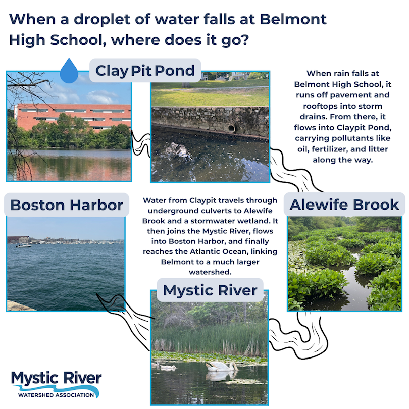 In the end, a raindrop that falls outside Belmont High School doesn’t just vanish. It flows through culverts, into ponds, along brooks, and down rivers. It picks up pollution from four municipalities. It passes kayakers, flows under the Earhart Dam, and enters the sea. Our responsibility to that water doesn’t end at our storm drain, and neither should our care for it.